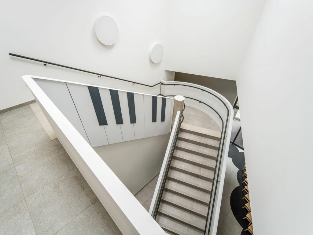 Důmyslně řešenému interiéru nechybí vzdušnost a dostatek světla. Je kombinací designu a funkčnosti, ale také hravých prvků. Například zábradlí centrálního schodiště architekt pojal jako veselou klaviaturu. Design jednotlivých místností je působivý, odráží severský styl a využívá rozmanitost přírodních materiálů.