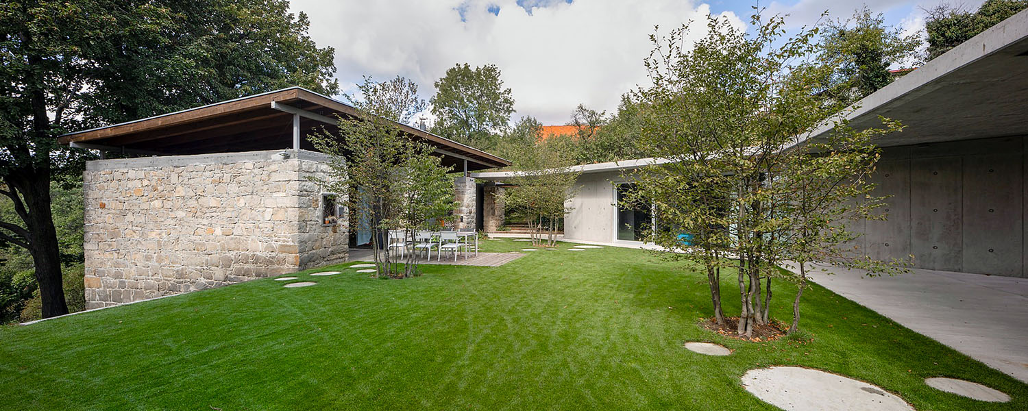 Zadáním bylo rozšířit dům o dvě ložnice, koupelnu a šatnu. Nebylo jednoduché přemýšlet o přístavbě k objektu, kterého si vážíme. Proto jsme se snažili zachovat ho v co největší míře a přistavět do svahu jen nenápadnou stavbu se zelenou střechou. Otevírá se do atria, kde se odehrává život rodiny. Nová stavba zároveň opticky odděluje vstupní prostor na pozemek pomocí přístřešku pro automobily a také chrání historickou kamennou stěnu. Přiznáním betonových konstrukcí v exteriéru i interiéru se snažíme o nepopírání přírodní podstaty materiálu.