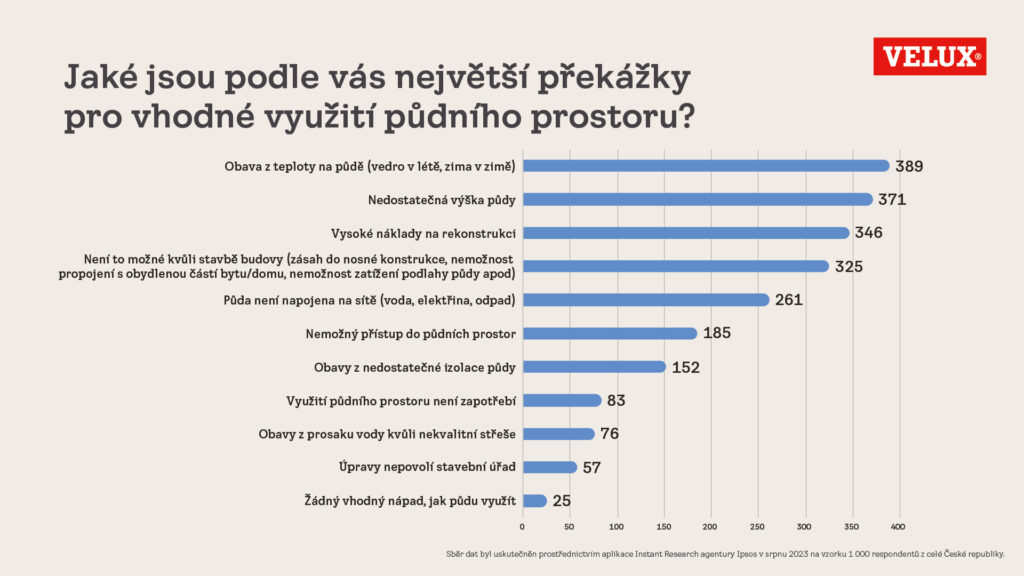 Za nejčastější důvod, proč domácnosti půdu více nevyužívají, přitom rodiny uvádějí vysokou letní teplotu, a naopak chlad v zimě (39 %), následují vysoké náklady na rekonstrukci (35 %). Zatímco tyto důvody lze vyřešit, jiné využití půdy skutečně komplikují – mezi ty patří především nemožná rekonstrukce kvůli ohrožení statiky domu (32 %) či nedostatečná výška půdy (37 %).