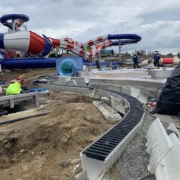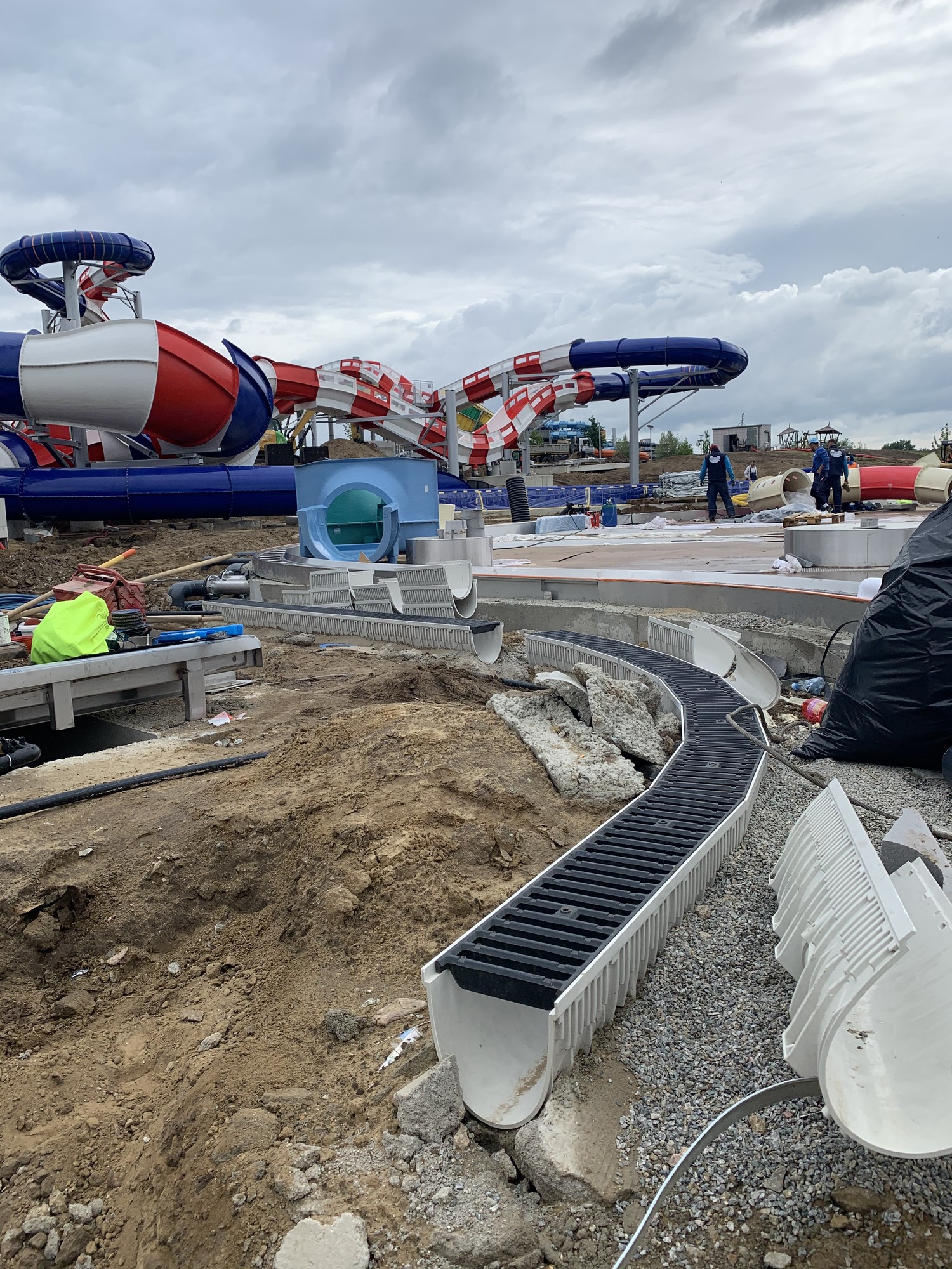 Letní areál v Aqualand Moravia na jižní Moravě 2x zvětšuje svoji plochu s vodními prvky. Nový vodní svět, divoká řeka nebo rodinný tobogán jsou nově otevřeny již tuto sezónu. Pro bezpečný pohyb dospělých i dětí musí být plochy kolem atrakcí perfektně odvodněny. O to se starají liniové štěrbinové žlaby MEA TSH. Štěrbina je na povrchu bezpečná pro chůzi a podpovrchové žlaby MEARIN 200 mají dostatečnou kapacitu i pro velké množství vody z atrakcí. Kolem celého dětského brouzdaliště jsou navrženy žlaby MEARIN TSH 200 v obloucích v malých poloměrech v délce cca 200 m.
