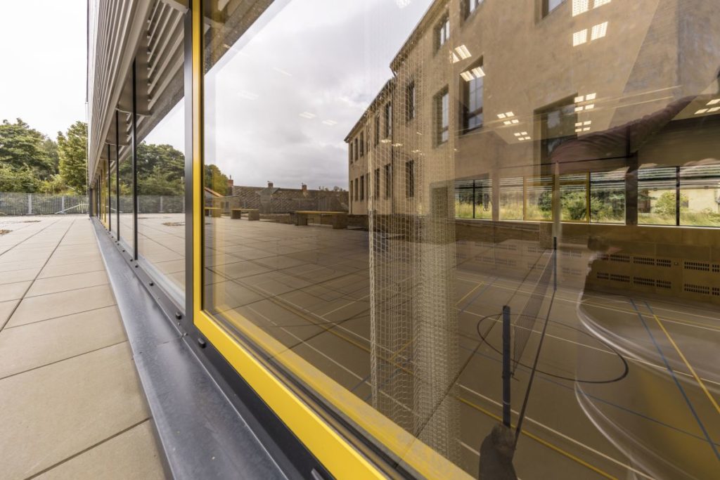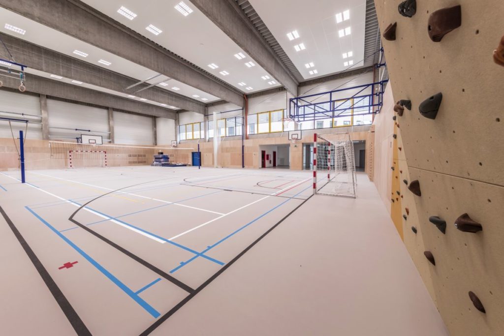 Vlastní tělocvična je konstrukčně železobetonový montovaný skelet. Nosnou konstrukci sendvičového střešního pláště tvoří trapézový plech s akustickými prvky. Skelet je opláštěn ocelovými kazetovými profily vyplněnými minerální vlnou. Fasádní výplně budovy jsou z hliníkových profilů. Pásová okna jsou doplněná o stínící lamelové prvky.