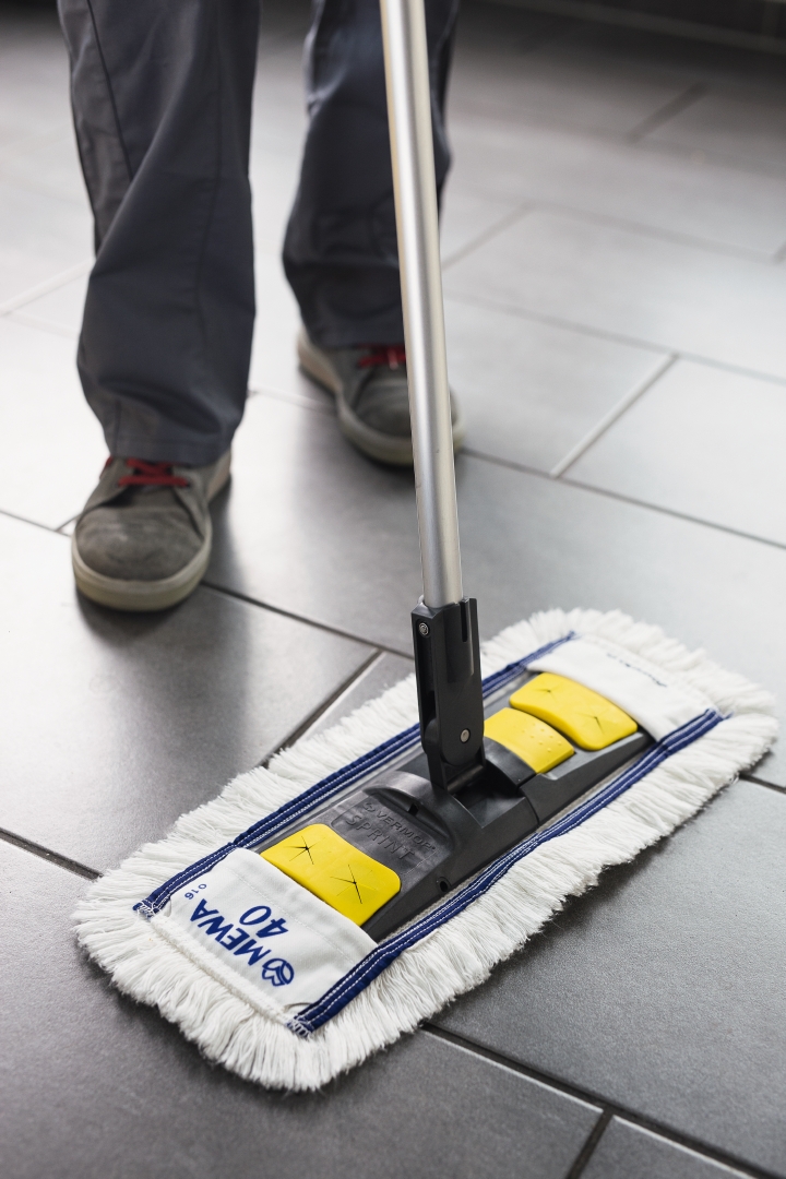 Poskytovatel textilních služeb MEWA nabízí kromě pracovních oděvů také úklidové mopy, které jsou schopné absorbovat obzvlášť velké množství nečistot a zaručují čistotu bez náročného a namáhavého tlačení a drhnutí. Tím se podporuje způsob úklidu, který je šetrný pro záda. Existují tři různé jakosti: mop z mikrovláken pro hladké a lehce strukturované podlahy, plyšový mop z mikrovlákna s vysokou savostí pro silně strukturované podlahy, jakož i tuftovaný mop z polyesteru a bavlněné příze pro všechny hladké podlahy.