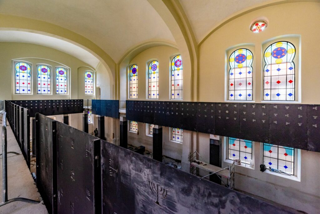 Kromě podlahy už jsou v synagoze i přilehlém rabinátu hotové truhlářské prvky, obložení sloupů i zábradlí. Stavbaři Metrostavu také dokončili fasády obou budov, včetně soklu. Zbývá kompletace elektroinstalací a zařizovacích předmětů a venkovních dlažeb a sadových úprav. Končí tak ojedinělý příběh o soukromém investorovi Danielu Černém, který nákladnou stavbu za desítky milionů korun zainvestoval částečně z dotace a vlastních prostředků.