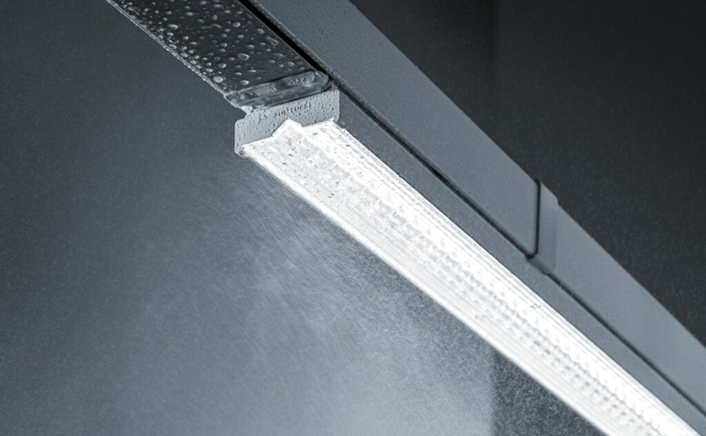 Všechny kritické spoje a připojovací místa svítidel TECTON IP64/IP54 značky Zumtobel jsou vybaveny těsnicími komponenty, které vytvářejí komplexní ochranu proti prachu a stříkající vodě. Horní a boční povrchy korozivzdorných lišt jsou zcela uzavřené a hladké, takže neposkytují žádný prostor, kudy by mohl vniknout prach nebo voda, a navíc se snadno čistí.