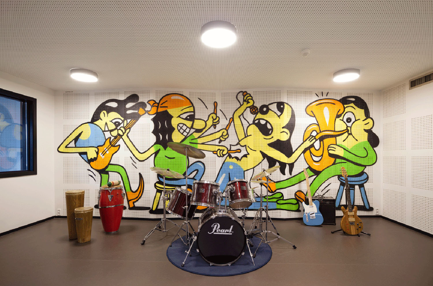 Výběr materiálu, zvláště ten podhledový a předstěnový, byl pro tento projekt zásadní. Architekt Uffe Bay-Smidt z KANT Architekter zvažoval tři zásadní aspekty: estetiku, ekonomickou stránku a funkčnost spojenou s akustikou. Před samotnou výstavbou porovnávalo studio dva různé typy materiálů, běžné minerální kazetové podhledy a sádrokartonové desky.