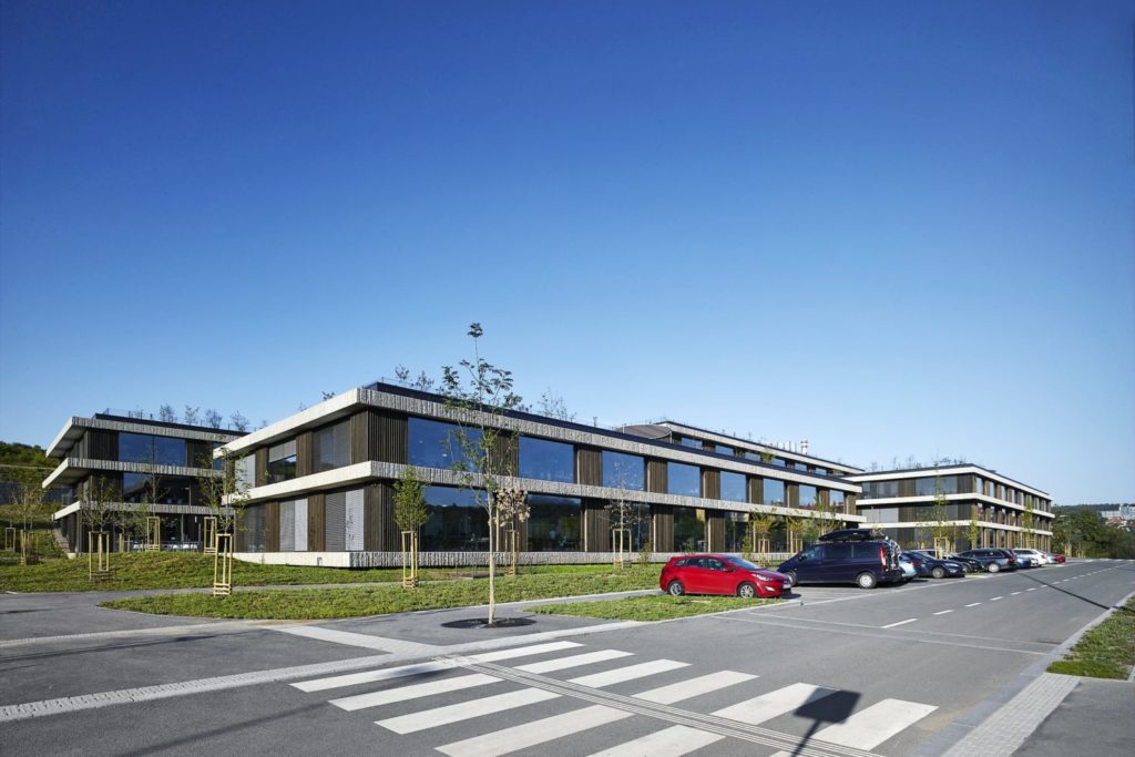 Vodorovné nosné konstrukce zakončují hrubé betonové římsy. Jejich ručně otloukaný povrch nese stopy po nástrojích, takže ve své materialitě obtiskují význam nosných stropních desek. Horizontálně frázují budovu a dokládají tak princip vrstvení jednotlivých podlaží odkazujících na vrstevnatost terénu. V místech kontaktu uživatelů byla fasáda realizována dokonale a jemně. Subtilní systémové rámy velkoformátových oken, nábytkově zpracované dřevěné perforované akustické panely z vnitřní strany meziokenních vložek, z vnějšku lehké dřevěné lamely.