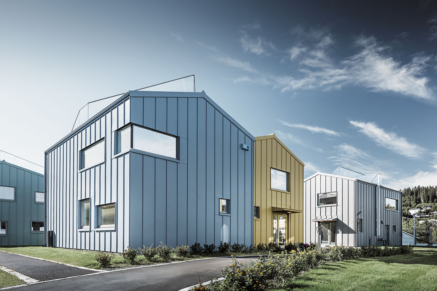 Využitá falcovaná krytina Prefalz byla jasnou variantou. Splňuje vše, co bylo při stavbě potřeba. V Norsku šlo o první velkou realizaci stavby s výrobky PREFA. Šéf pokrývačů Dag-Arne Gundersen se práce zhostil skvěle. Se svými zaměstnanci se věnoval fasádám a střechám třiadvaceti domů během celého roku. Jak ale vzpomíná, práce to byla občas nelehká.