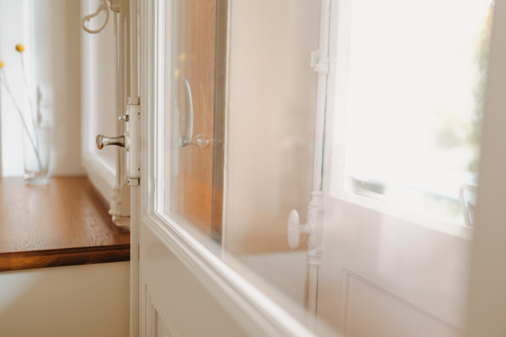 Podobný přístup zaujali projektoví manažeři i ke dvěma proskleným dveřím městského domu, z nichž jedny směřují do ulice a druhé se otevírají na terasu do dvora. Dveře do ulice vyžadovaly ultratenkou těsnicí jednotku, ale pro dveře na terasu musela společnost Holzmanufaktur Rottweil vyvinout řešení zcela na míru: REVETRO. Díky záchraně stávajícího skla dveří a jeho použití jako vnějšího skla v nové energeticky účinné těsnicí jednotce mají renovované terasové dveře původní sklo s autentickými pruhy, vlnami a bublinami.