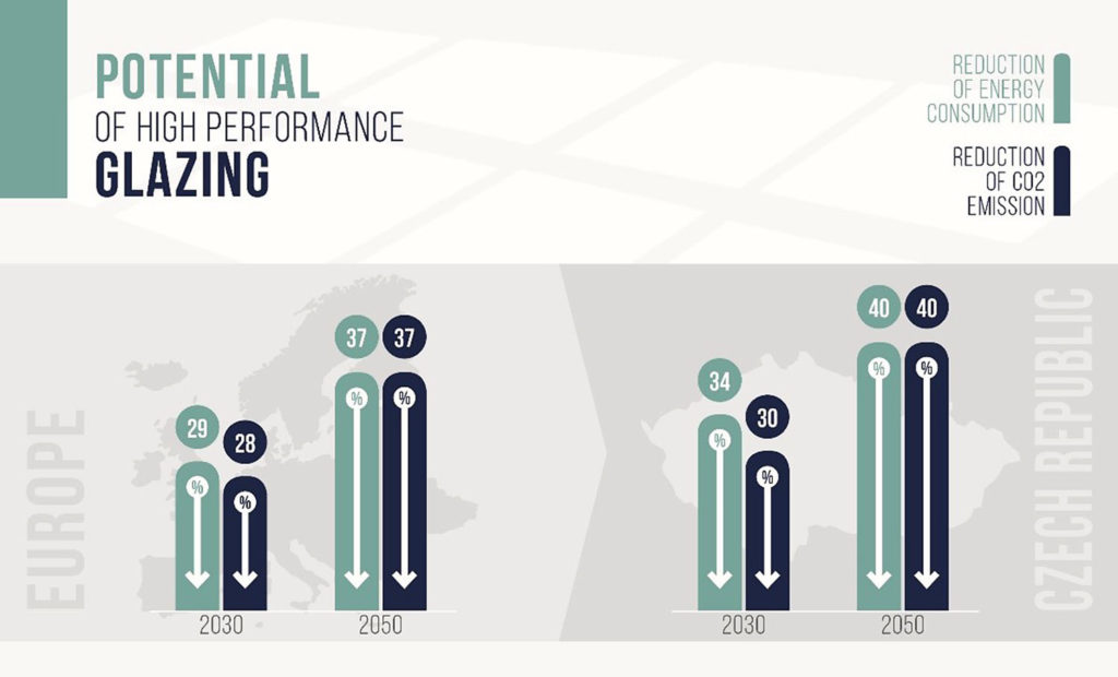 Podle scénáře do roku 2050 by potenciální úspora energie byla na úrovni 37 % s podobným snížením emisí CO2. Odhady pro Českou republiku jsou ještě optimističtější. Použití správného typu skla by mohlo v roce 2030 snížit množství energie spotřebované budovami a emise CO2 během jednoho roku o 34, respektive 30 procent.