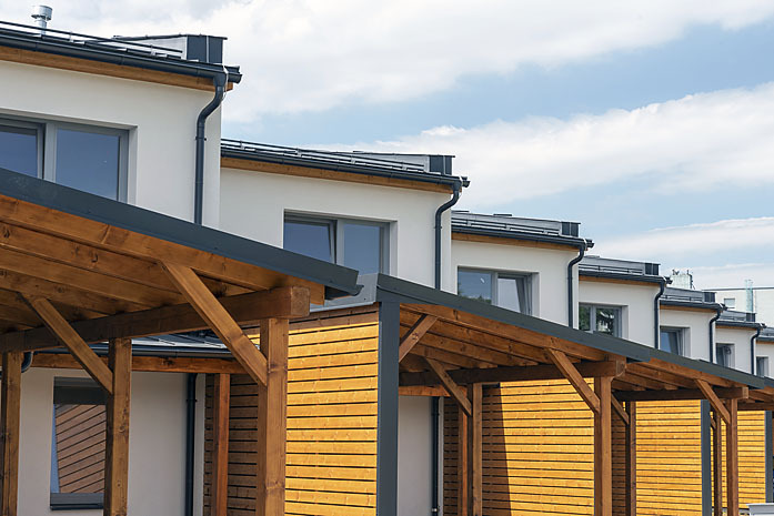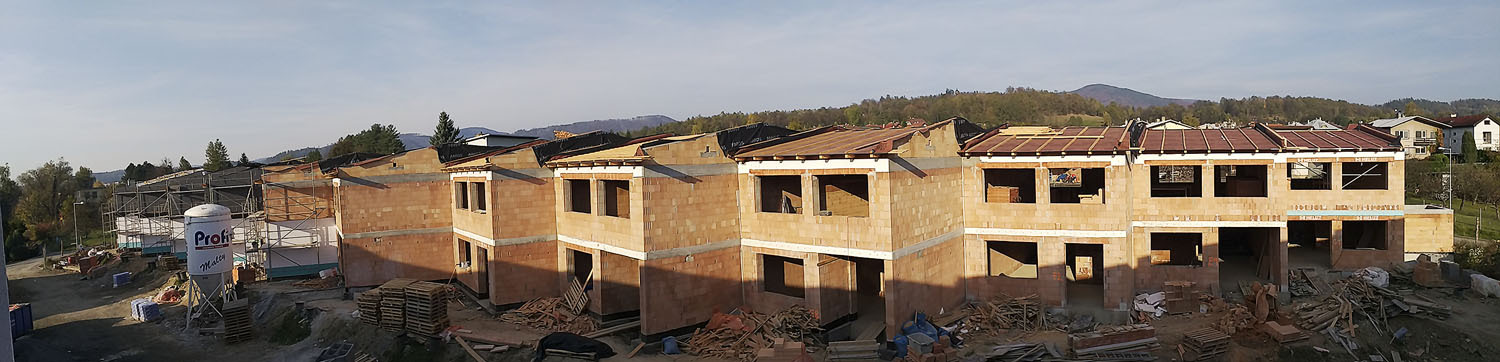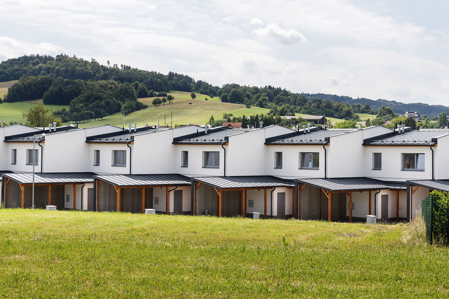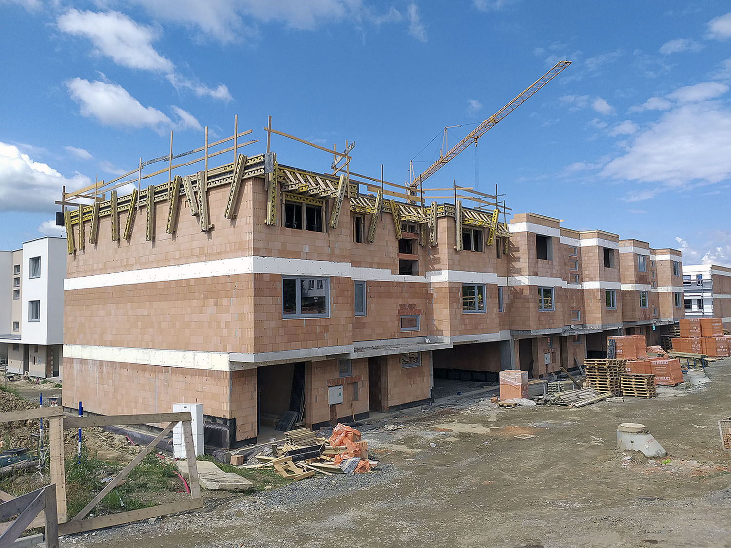 Obvodové zdivo bytových i řadových domů bylo navrženo z broušených cihel HELUZ PLUS 38, které společně s kontaktním zateplovacím systémem tvoří energeticky úspornou obálku. V kombinaci s masivní železobetonovou stropní konstrukcí získala stavba dobré akumulační vlastnosti, které zajistí teplotní stabilitu interiérů ve všech ročních obdobích. Tento systém zároveň představuje velmi dobrou akustickou ochranu před hlukem zvenčí i před přenášením hluku mezi místnostmi.