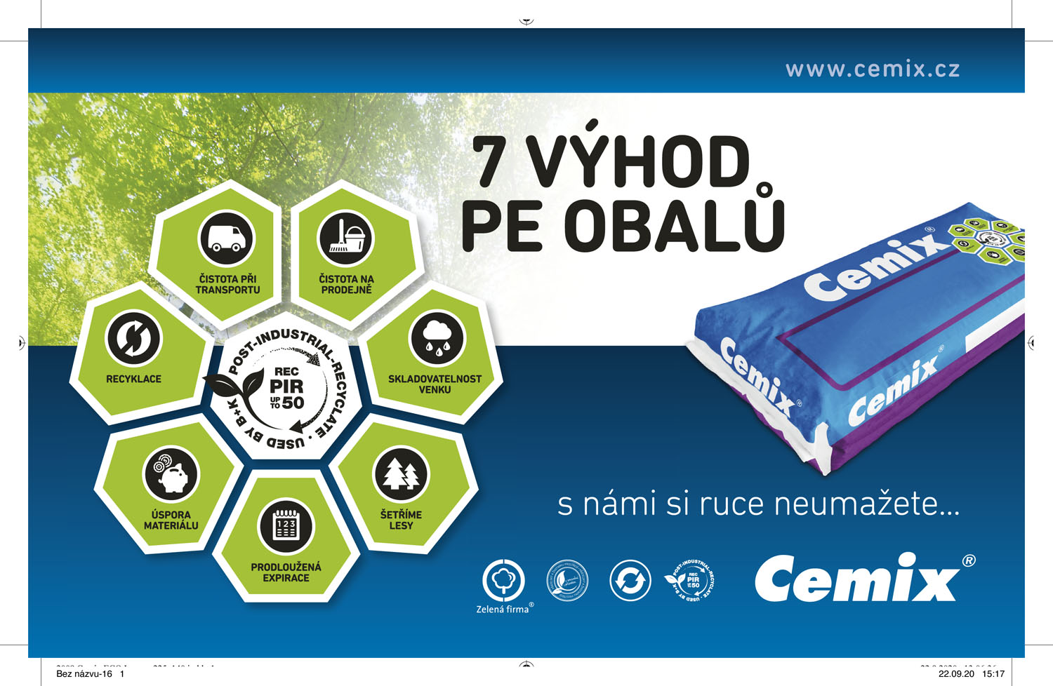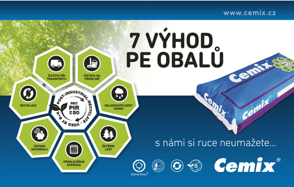 Nestává se příliš často, aby výrobce suchých stavebních směsí přišel se zásadní novinkou, která by ovlivnila způsob nakládání s materiálem před jeho vlastní aplikací. Snad jen občas se objevil facelift designu obalu, který měl za cíl hlavně přitáhnout pozornost a poskytnout zákazníkovi všechny důležité a zákonem předepsané informace. Nyní je však na trhu novinka firmy Cemix, která zacházení s materiálem ještě více usnadní a zjednoduší. Suché stavební směsi Cemix budou nyní baleny ve zcela nových plně recyklovatelných polyethylenových pytlích.