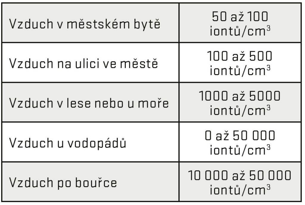 Pokud chceme shora teoreticky popsaný proces tvorby záporných iontů ověřit v praxi, nezbývá než se pustit do světa číselných hodnot. K základní orientaci by měly sloužit přibližné hodnoty koncentrace záporných iontů (měřené v jejich počtu na cm3), a to v různých typech prostorů: