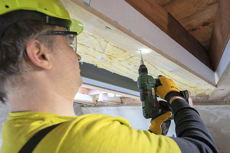 Takto slepená sestava (prkno + izolační trámky) se přiloží ze spodní strany krokve a přivrtá se k tomu určenými vruty v osové vzdálenosti dle statických tabulek. Takto pokračujeme na všech krokvích, které chceme zateplit. Do vytvořené dutiny mezi krokve a mezi konstrukční prvky aplikujeme tepelnou izolaci.
