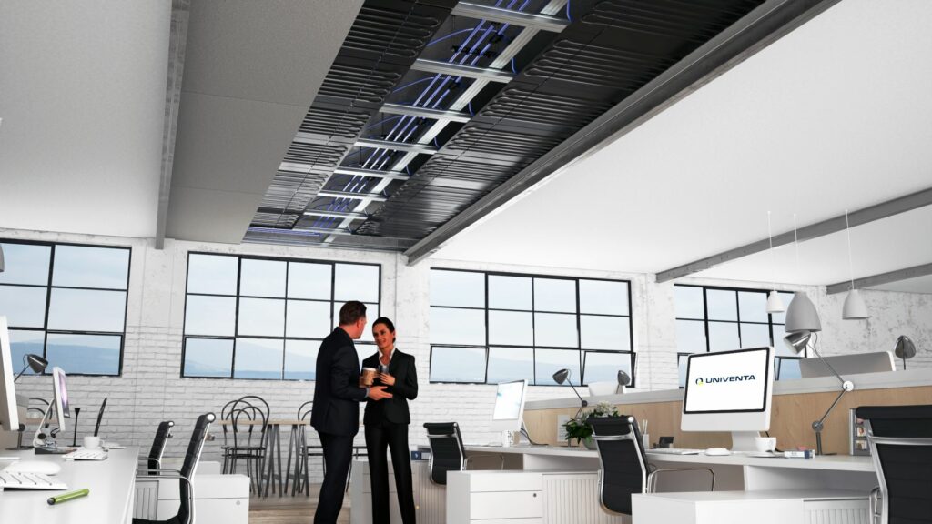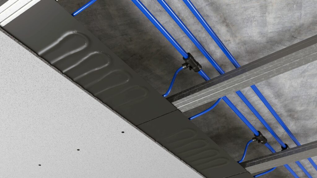 Tento způsob ochlazování interiérů je populární zejména v kancelářských budovách, instalovat se ale dá i do rodinných domů. V praxi se jedná o polyurethanovou trubku s kyslíkovou bariérou zatavenou mezi dvě tepelně vodivé hliníkové fólie. Schopnost chlazení pak spočívá v tzv. vysokoteplotním chlazení, kdy voda v trubkách má teplotu 16 °C, na rozdíl od běžné klimatizace, která vyžaduje vstupní teplotu kolem 6 °C pro dosažení stejného chladícího účinku. Tento princip umožňuje výrazně snížit spotřebu energie, a přitom poskytuje stejný komfortní pocit teploty. Pro vytápění naopak systém využívá teplé vody. Ideální je podle Roberta Hoška kombinace se sádrokartonovými deskami s vysokou tepelnou vodivostí, například ty obohacené o grafit. „Ty výborně rozvádí chlad v celé své ploše a zlepšují tak výkon systému i při použití menší plochy chladícího tělesa,“ vysvětluje odborník z Rigipsu.