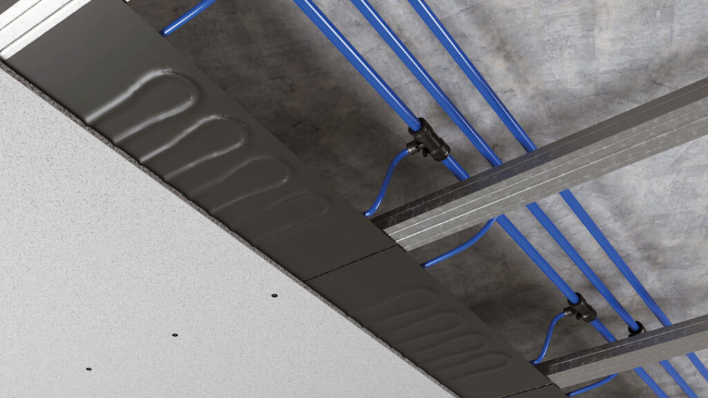 Tento způsob ochlazování interiérů je populární zejména v kancelářských budovách, instalovat se ale dá i do rodinných domů. V praxi se jedná o polyurethanovou trubku s kyslíkovou bariérou zatavenou mezi dvě tepelně vodivé hliníkové fólie. Schopnost chlazení pak spočívá v tzv. vysokoteplotním chlazení, kdy voda v trubkách má teplotu 16 °C, na rozdíl od běžné klimatizace, která vyžaduje vstupní teplotu kolem 6 °C pro dosažení stejného chladícího účinku. Tento princip umožňuje výrazně snížit spotřebu energie a přitom poskytuje stejný komfortní pocit teploty. Pro vytápění naopak systém využívá teplé vody. Ideální je podle Roberta Hoška kombinace se sádrokartonovými deskami s vysokou tepelnou vodivostí, například ty obohacené o grafit. „Ty výborně rozvádí chlad v celé své ploše a zlepšují tak výkon systému i při použití menší plochy chladícího tělesa,“ vysvětluje odborník z Rigipsu.