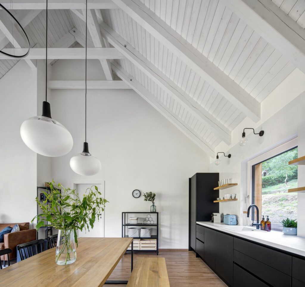 Bílé stěny a do dřeva laděné podlahy barevně oživuje minimalistická černá kuchyňská linka v bezúchytkovém provedení a s úpravou proti ulpívání otisků prstů. Masivní dubový stůl zhotovený na míru skýtá dostatek prostoru pro společné posezení s častými návštěvami.