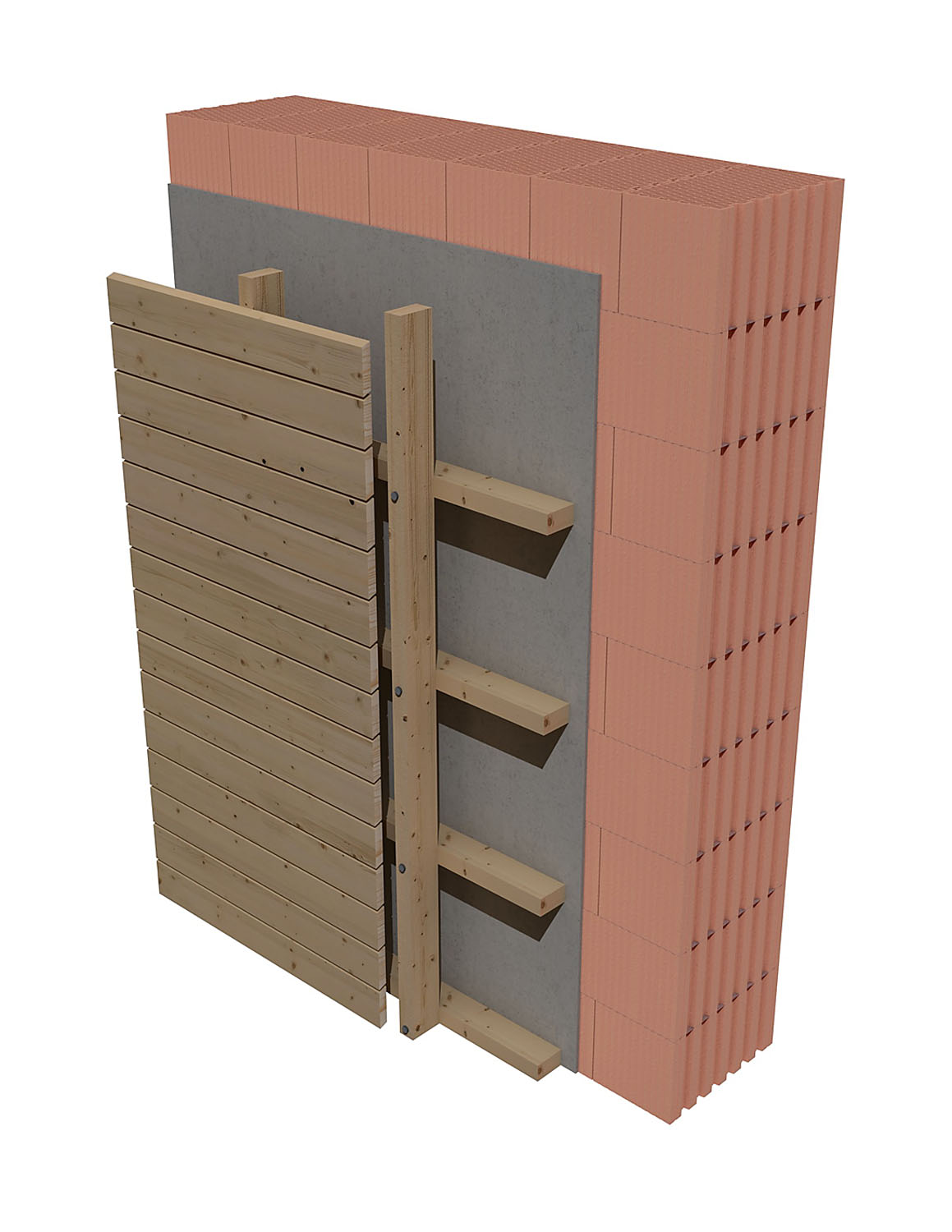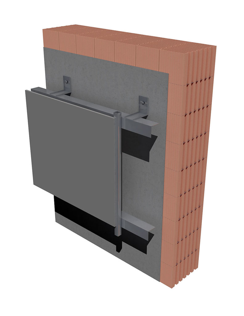 Skladba provětrávané fasády (bez vložené tepelné izolace) s obvodovými bloky HELUZ FAMILY či FAMILY 2in1 splňující požadavky ČSN 73 0540-2: opláštění fasády, nosný rošt (svislé a vodorovné profily – závislé od statického schématu roštu), kotvicí prvky nosného roštu, provětrávaná dutina (mezera) a nosná konstrukce obvodového pláště (do které je nosný rošt ukotven) z cihelných bloků FAMILY nebo FAMILY 2in1.