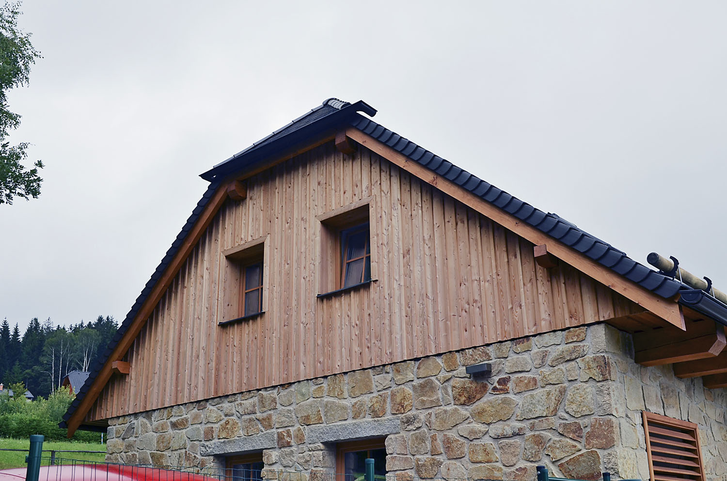 Dřevěné obklady, zejména štítů jsou zvláště oblíbené zejména v podhorských a horských oblastech. Pro docílení správné funkce odvětrání vodních par se první rošt (připevňovaný k nosné stěně) ukládá ve vodorovném směru. Pokud je požadován svislý obklad, použije se křížový rošt, aby byla zaručena správná funkce odvětrání. Rošt, na který se upevňuje vnější obklad, musí být impregnován proti dřevokaznému hmyzu a hnilobě.
