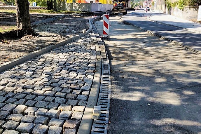 V letních měsících probíhala rekonstrukce a odvodnění mnoha silnic v naší republice i na Slovensku. Stále častěji projektanti i stavitelé používají systém liniového odvodnění pro vozovku i chodníky. Z ulic je dešťová voda svedena obrubníkovým odvodněním MEA KERB a příčné odvodnění přes křižovatku vyřešeno monolitickým systémem MEA DM2000. Využití obrubníku chodníku neomezuje šíři vozovky. Voda může plynule odtékat i při nulovém podélném spádu a netvoří se kaluže. Chodci nejsou ostřikováni vodou z projíždějících vozidel. Obtížné spádové podmínky silnice v Klíčovicích na Plzeňsku také vedly k využití podélného obrubníkového odvodnění.