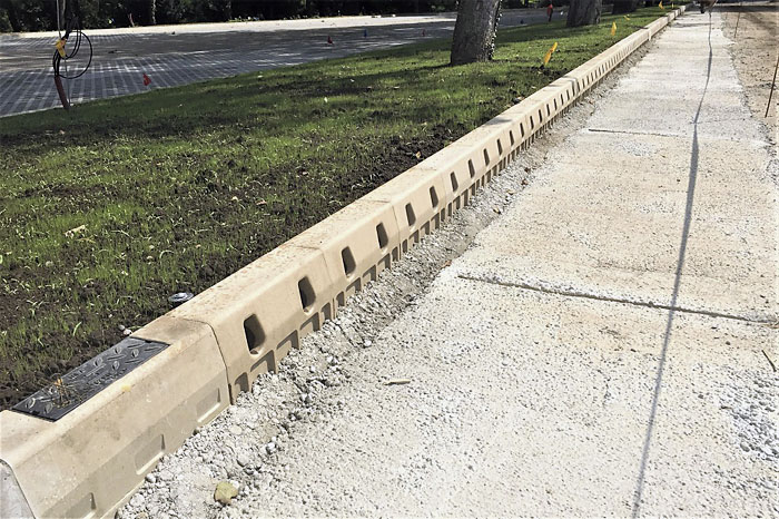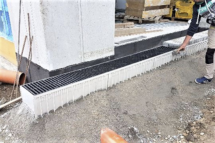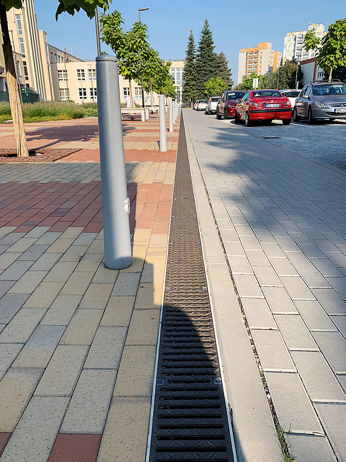 I při malých spádech voda odtéká obrubníkem MEA KERB mimo vozovku přes systémovou vpusť do kanalizace. Odvodňovací linie není přerušena ani vjezdy a snížené prvky se vtoky umožňují plynulý průtok a snadný průjezd do bočních vjezdů. Na fotografii jsou žlaby MEA KERB před aplikací finální povrchové vrstvy vozovky (obec Cabaj-Čápor, Nitra).