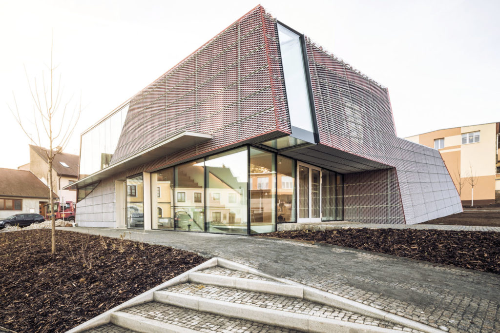 Podle architektonického návrhu bylo základním požadavkem na výsledný vzhled stavby modlitebny použití sendvičových PIR panelů se zavěšenou pohledovou konstrukcí tvořenou tahokovem, a to jak na fasádní, tak střešní plášť objektu. S ohledem na tvarovou složitost budovy však standardní použití opláštění sendvičovými panely nepřicházelo v úvahu.