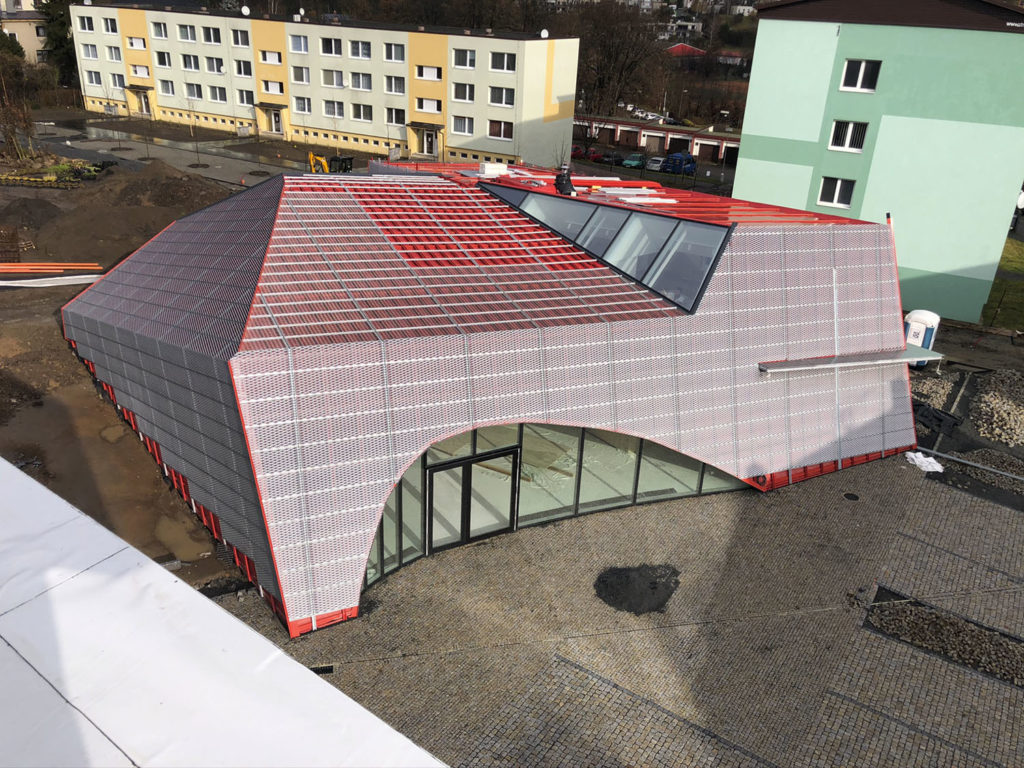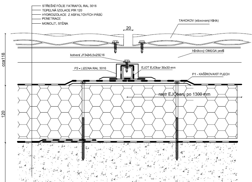 V jednotlivých případech by použití kotevních prvků neznamenalo podstatné snížení tepelně-technických parametrů obvodového pláště, avšak při vytvoření husté sítě pro ukotvení tahokovu jsme museli vzít tento parametr v úvahu. Místo předpokládaného kotvení sendvičových panelů na ukloněné stěny obvodového pláště nebo samotných tahokovů pomocí závitových tyčí s problematickým utěsněním prostupů hydroizolační fólií byl navržen a následně aplikován systém, který se běžně používá při kotvení technologických zařízení na plochých střechách.