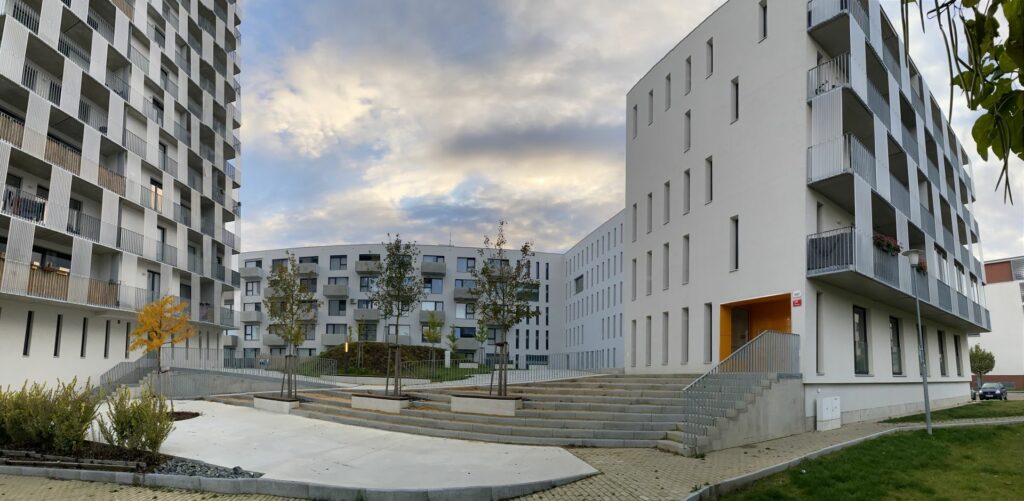 Původně zde přitom byl plánovaný blok ve tvaru „U“, jakých lze v této části Plzně nalézt bezpočet, a s plně podparkovanou plochou areálu. „Nový koncept jsme založili na vybudování dvoupodlažního podzemního parkoviště. Došlo tak k uvolnění vnitrobloku, kde jsme mohli ponechat prostor zeleni. Namísto původní kompozice jsme zvolili uspořádání ve tvaru „L“ se samostatnou věží, která výškově navazuje na stávající panelové domy. Získali jsme tak výhodnější polohu pro byty,“ dodává Ing. arch. Jiří Zábran. Těch je v celém objektu 155 s dispozicí od 1+kk až po 4+kk. „Jádrem obou staveb jsou především byty 2+kk, u kterých je výhoda poměrně nízké ceny a zároveň dobré užitné hodnoty. Investor si totiž všiml, že na tomto sídlišti je nedostatek bytů. Přitom zde dorůstá další generace, která tu má rodiny a chce zde zůstat. Proto jsme přistoupili k návrhu spíše malometrážních bytů. Dnes jsou prodané všechny,“ dodává architekt. Obyvatelé horních pater věže se tak mohou kochat výhledem do malebného okolí ze tří stran obklopeného přírodou. Kromě polí a lesů tu najdete třeba i zoologickou zahradu nebo rozhlednu. Do budoucna ale město počítá s další zástavbou.