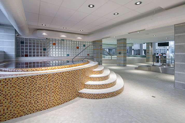 V prostorech u výstupních žebříků nahrazuje velký formát mozaika 5 x 5 cm, rovněž ze série Cemento. Jde o funkční prvek zohledňující velké množství vody, které při opouštění bazénu stéká na podlahu a může snížit protiskluz. Mozaika má oproti velkému formátu vysoký podíl spár, které pomáhají vodě odtéct. Volba mozaiky je tak dalším krokem k vyšší bezpečnosti návštěvníků, kteří se tu mohou cítit komfortně. Ze stejného důvodu byly mozaiky navrženy také pro podlahy ve sprchách a v okolí vodních atrakcí.