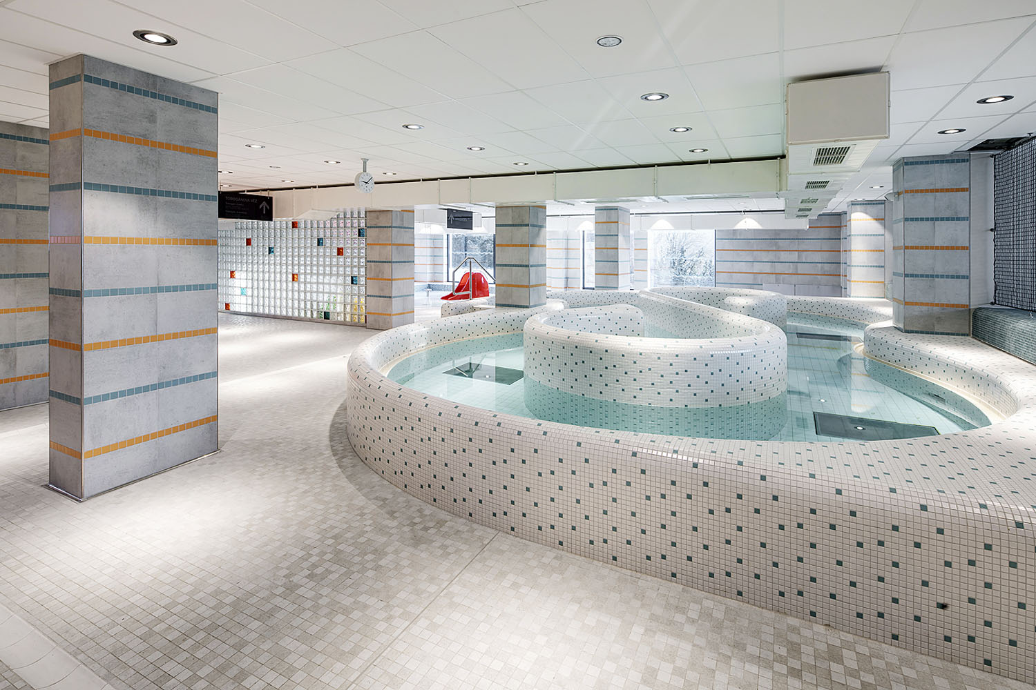Všechny bazénové vany jsou provedeny z dlaždic série ColorTwo formátu 20 x 10 cm, R10/B, především v odstínech tyrkysové (vnitřní bazény) a modré (venkovní bazény). Nášlapy schodů do vody a borty, na kterých stojí skokanské můstky, tvoří hutné dlaždice ColorTwo formátu 10 x 10 cm s protiskluzem C podle platné normy.