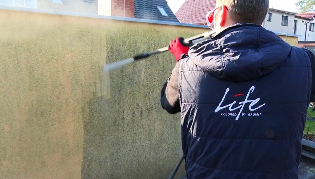 Pokud jsou však při kontrole zateplené fasády zjištěny známky biologického napadení, musí dojít nejprve opět k omytí čistou tlakovou vodou a po oschnutí k aplikaci vodou ředitelného sanačního nátěru Baumit FungoFluid. To se provádí pomocí válečku, popř. malířské štětky.