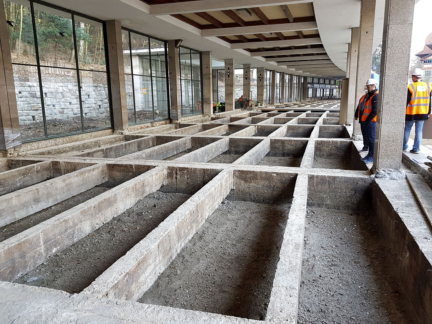 Stavební práce byly zahájeny na podzim 2018 a potrvají až do září letošního roku. V březnu dodala společnost Lasselsberger první dodávku replik původních keramických dlaždic RAKO. Zahájení obkladačských prací na Vincentce je plánováno na přelom dubna a května, následovat bude plocha kolonády, kde je třeba začít od středového motivu.