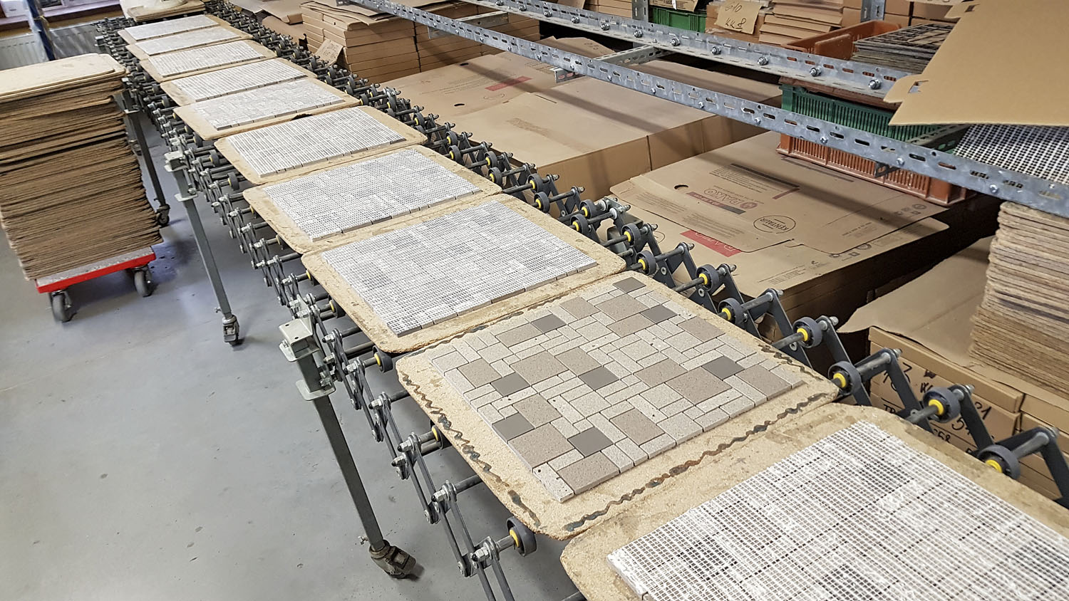 Mozaiky se při výrobě řežou pilami, jednotlivé dílky se ručně skládají na podložku s rastry mozaiky. V rastrech jsou již zapracované spáry, přesto stojí pracovníci výroby před zodpovědným úkolem: Skladba mozaiky, schválená Národním památkovým ústavem, musí být přesně dodržena.