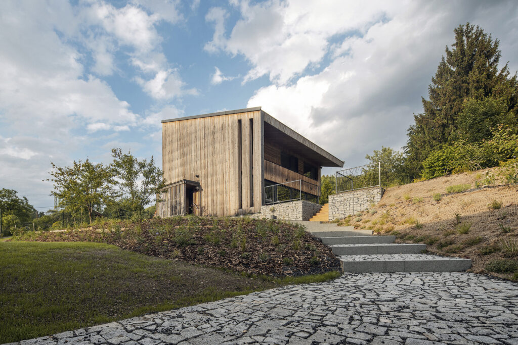 Architekt Lukáš Pejsar dodává: „Jedna z největších výzev bylo umístění stavby, terén je tu svažitý a klient přitom požadoval alespoň kousek rovného pozemku, kde by si mohly hrát děti. Prioritou bylo také propojení domu s exteriérem. Prosklený obývací prostor s jídelnou a kuchyní se povedlo vytvořit tak, abychom zachovali intimitu i pro sousedy.“