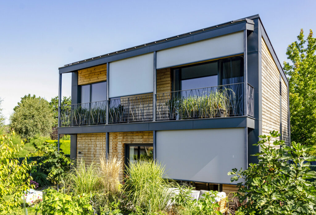 Stěny domu se vybudovaly z lepených masivních dřevěných panelů tl. 84 mm, stropy jsou dřevěné trámové, krov byl řešen pomocí nosníků Steico Joist. Stropní trámy jsou zaklopeny deskami SWP. Svislé obvodové konstrukce a střecha jsou opatřeny minerální tepelnou izolací. Sokl domu je zateplen tvrzeným polystyrenem o tl. 160 mm. Fasády mají horizontální obklad ze sibiřského modřínu. Střecha je plochá s PVC krytinou, na níž je souvrství zelené střechy. Stejná zelená střecha je i na krytém stání a skladu. Dům má díky fotovoltaice vlastní zdroj elektřiny, kompaktní jednotka s aktivní rekuperací se stará o výměnu a dohřívání vzduchu. Když je potřeba více tepla, přidá se elektrické podlahové vytápění.