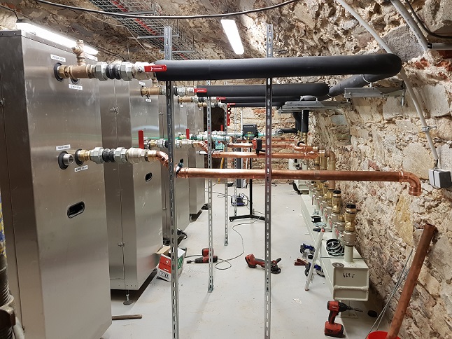 Sanpress Inox byl kromě běžných sanitárních rozvodů použit také pro rozvody glykolového chlazení. O samotné chlazení a topení se stará celkem šest tepelných čerpadel která jsou doplněna dvěma stacionárními nerezovými kondenzačními plynovými kotli Buderus Logano plus SB625-185 s celkovým výkonem 370 kW a hmotností 1,5 tuny. Technologie rozdělovačů topných okruhů plošných otopných systémů a vybavení kotelny včetně chladicích okruhů je realizováno pomocí kombinace osvědčeného systému spojování měděných trubek Viega Profipress a systému Viega Prestabo z nelegované (uhlíkové) oceli 1.0308 (E235), podle DIN EN 10305 3 s vyžitím velkých průměrů, a to až do dimenze DN108.