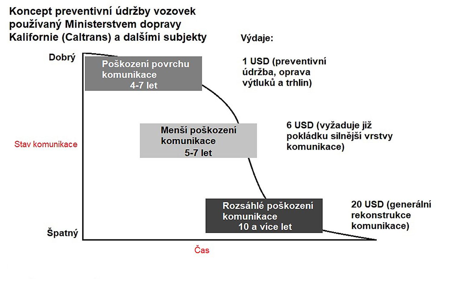 Ministerstvo dopravy amerického státu Kalifornie (California Department of Transportation – Caltrans) popisuje výhody prevence údržby vozovek na úkor jejich generálních oprav poměrem 1:6. Podle něj činí náklady na prevenci pouhou jednu šestinu oproti tomu, kolik by stála generální oprava vozovky: jinými slovy, dolar vložený do prevence zabrání investici šesti dolarů, vynaložených na celkovou rekonstrukci komunikace. Přitom tato čísla podle Caltransu zahrnují pouze prvotní náklady: nepromítají se do nich např. náklady na opravy dopravních prostředků v důsledku nehod způsobených výtluky či trhlinami, opotřebení dopravních prostředků jezdících po špatných silnicích apod.