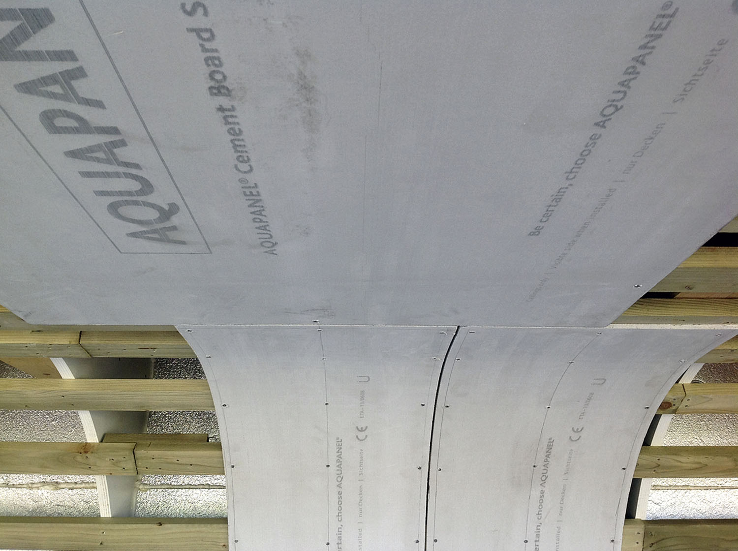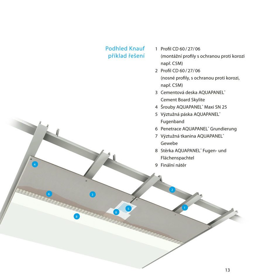 Příklad typického řešení podhledu je patrný z obrázku. Na montážní a nosné CD profily opatřené antikorozní úpravou se přišroubují 8mm desky AQUAPANEL SKYLITE. Vhodné šrouby jsou AQUAPANEL MAXI SN 25. Do spár se vtlačí tmel a do něj výztužná páska a zafixuje stěrkou. Na to přichází penetrace a nakonec celoplošná stěrka s vloženou výztužnou tkaninou. Finální je pak barevný nátěr.