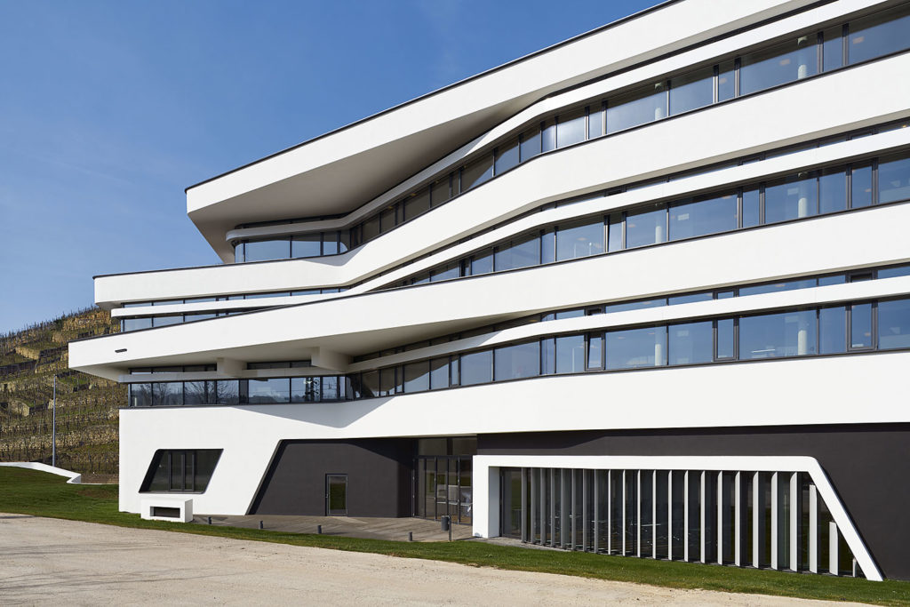 Vypořádání se s umístěním pozemku bylo pro architekty výzvou. Budova leží na okraji nových developerských projektů s různorodým využitím. Zužující se trojúhelníková stavba je vklíněná mezi železniční trať, hlavní silnici a vinici v pozadí. Architektům (fritzen 28] z Esllingenu se podařilo vytvořit nenásilný přechod mezi přírodou a zástavbou a zatraktivnit vstup do města.