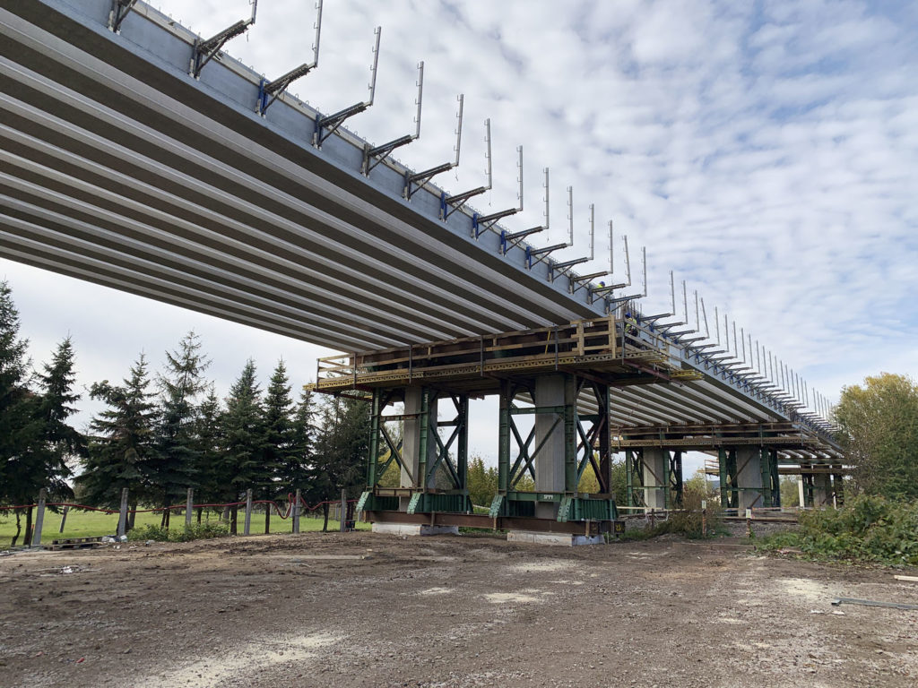 Po dokončení výstavby 12 pilířů a realizaci podložiskových bloků následovala montáž podpěrné skruže nosné konstrukce vynášející prefabrikované příčníky a nosníky do doby jejich spřažení s nosnou konstrukcí.