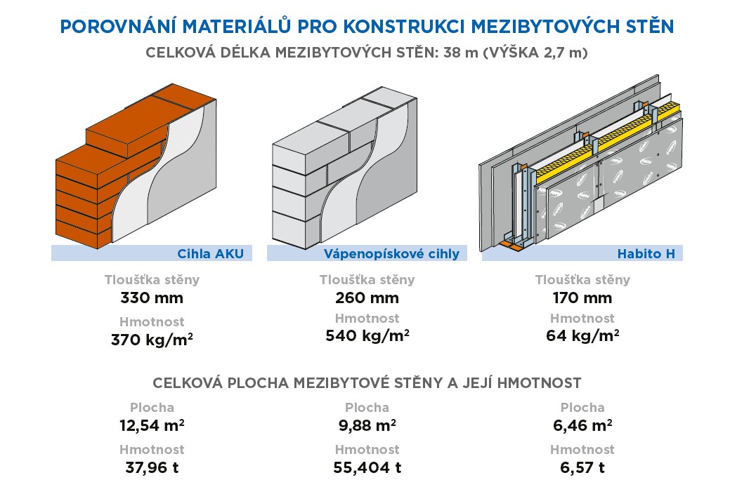 Pro ilustraci se můžete podívat na příklad vzorového podlaží bytového domu se čtyřmi bytovými jednotkami s celkovou délkou mezibytových stěn 38 m. Úspora s Habito H je až 6,08 m2 (1,52 m2/byt). Pokud bychom sádrokarton využili i na konstrukci vnitřních příček, mohli bychom získat ještě více užitné plochy.