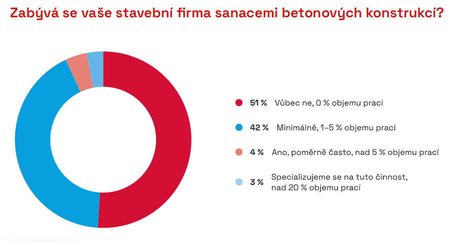Na sanace se zpravidla zaměřují specializované firmy. Podle analýzy se sanacemi častěji zabývají 4 % firem a přímo se na tuto oblast specializují 3 % stavebních firem. Polovina dotázaných stavebních společností (51 %) se sanacemi betonových konstrukcí naopak vůbec nezabývá. Další výrazná část dotázaných (44 %) se sanacemi zabývá pouze v rozsahu do 5 % objemu práce.