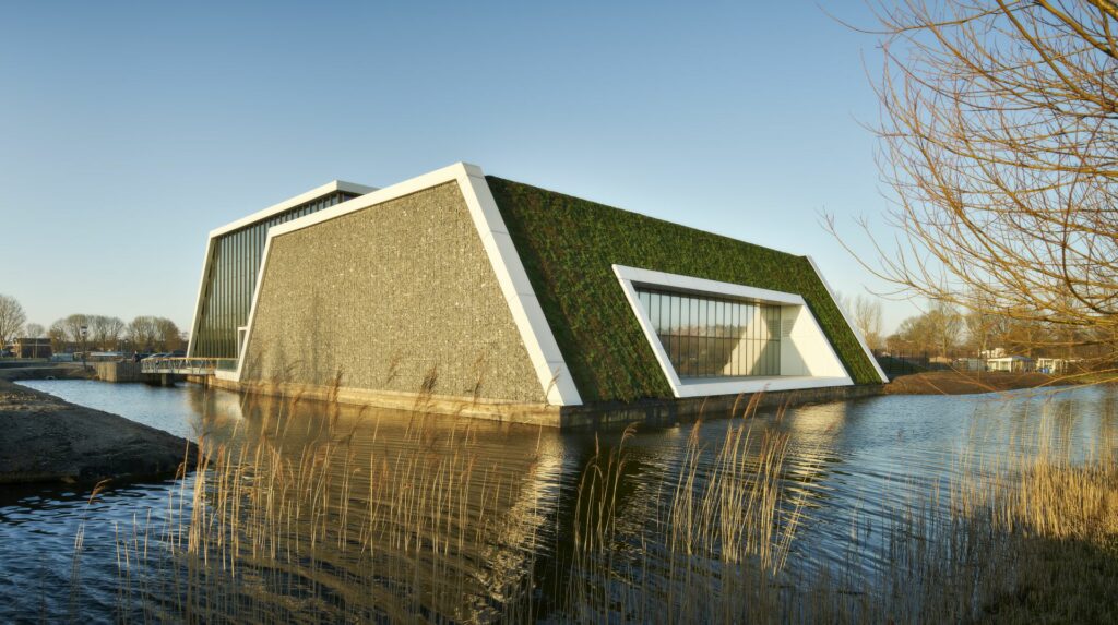 Vymodelovali jsme tělo hráze. Je porostlé vegetací, stejně jako hráze v Holandsku. Materiály používané při stavbě hrází jsme integrovali i do našeho projektu: Vertikální fasádní části jsou zabudovány v čedičových gabionech. Chtěli jsme novostavbě dodat zvláštní “ostrost”. Hrajeme si s hranami a liniemi, kdy okapy pomalu přecházejí do chodníku před vstupní částí a poté se znovu zvedají do sedlové střechy.