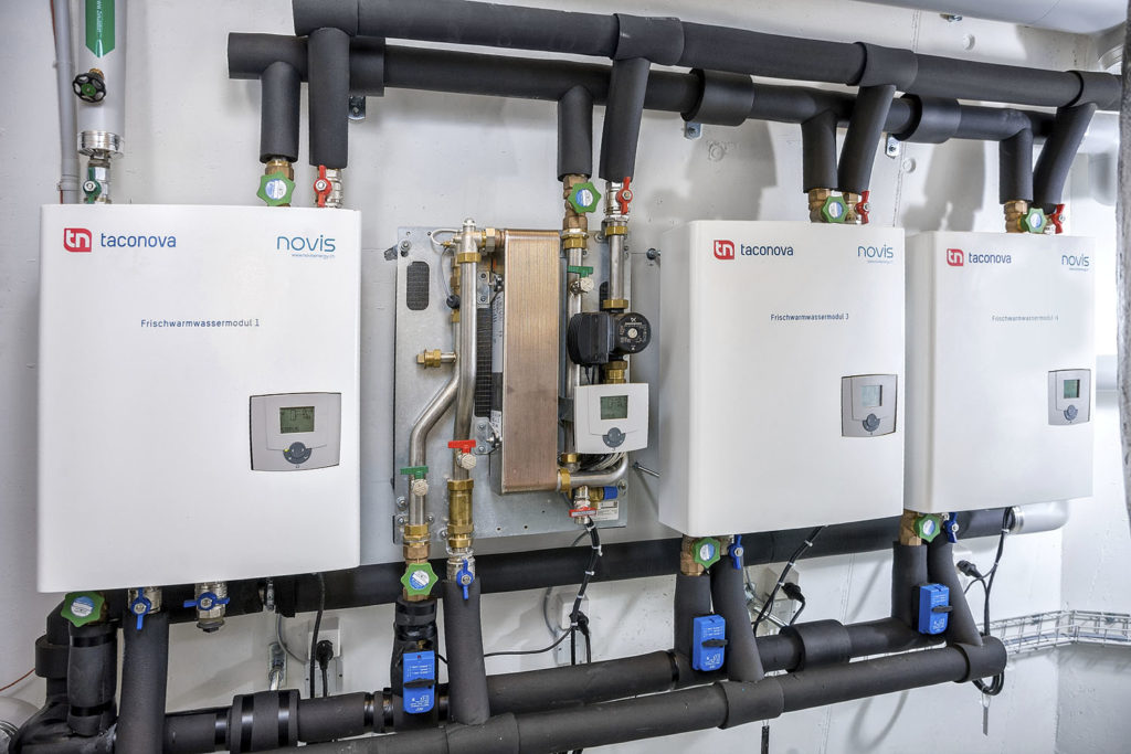 „Pro hlavní budovu musí být k dispozici výrazně větší množství ohřáté pitné vody, než může dodat jednotlivá stanice. Z tohoto důvodu jsme zde navrhli 4stupňovou kaskádu ze čtyř stanic TacoTherm Fresh Peta X,“ vysvětluje postup Rolf Wende, jednatel firmy Novis Energy AG, která prováděla montáž stanic čerstvé teplé vody.