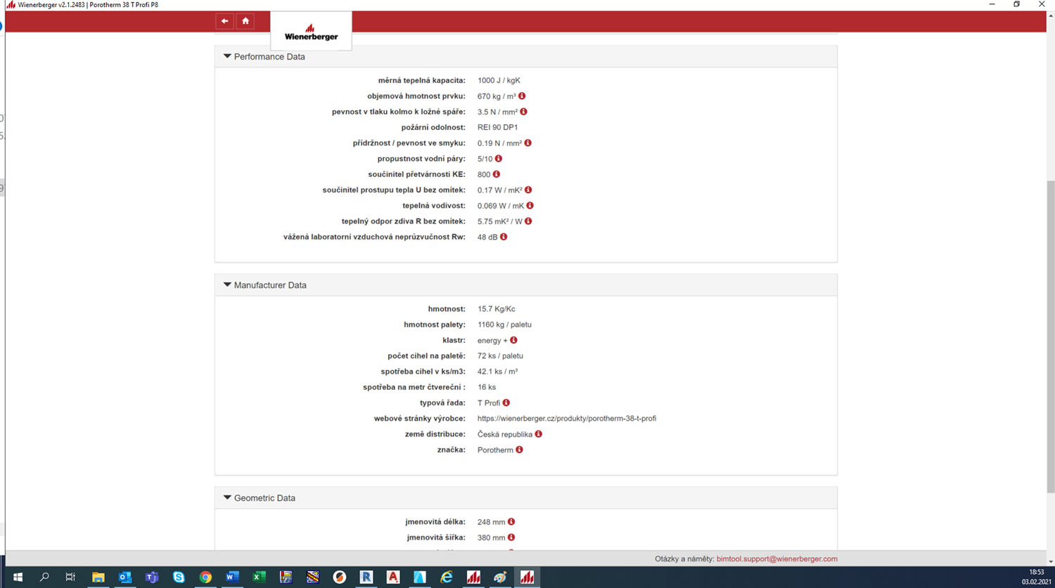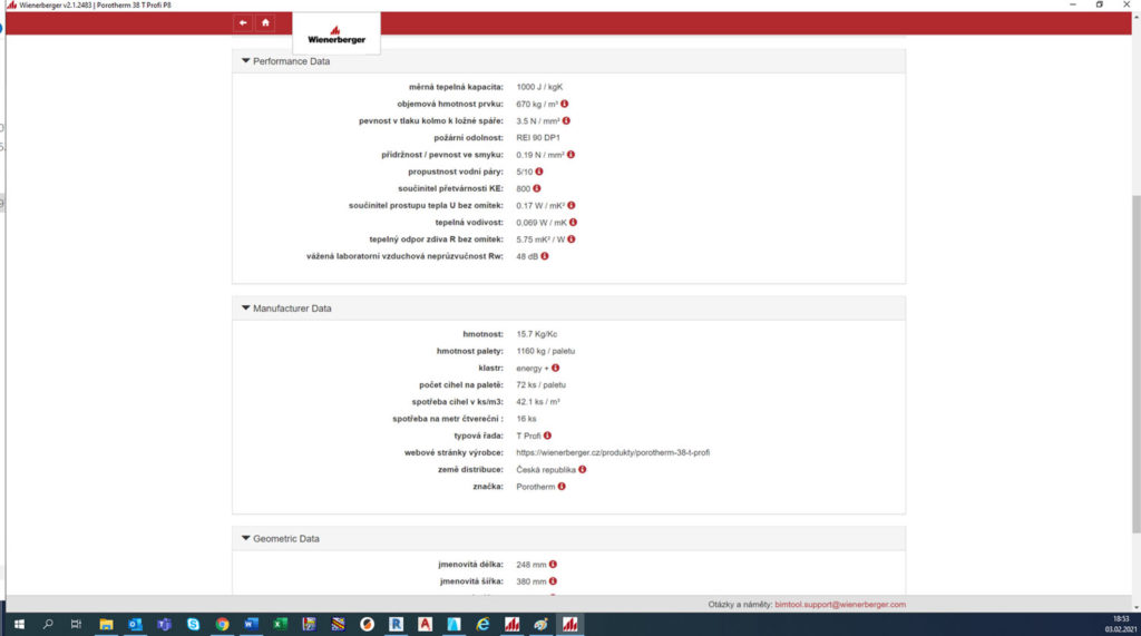 Zde je třeba pochopit, že vkládaná data jsou aktuální a ověřená přímo výrobcem, jelikož jsou importovaná přímo z produktové databáze společnosti Wie nerberger. Tím nemůže dojít k vybrání produktu, který má buď zastaralá data nebo se například již nevyrábí. Data jsou do BIM modelu dále vkládaná v požadované podrobnosti. Pro cihelné zdivo je opět rozdíl, jestli je vyžadován detail pro dokumentaci ve stupni stavebního povolení, nebo ve stupni prováděcí dokumentace. Příběh dále pokračuje samotnou výstavbou, kdy stavební firma cihelnou tvarovku zabuduje do stavby dle informací získaných z 3D informačního modelu, což zjednodušuje koordinaci na stavbě, evidenci prostavěnosti a ověření instalace správného produktu. Na závěr je informační model předán včetně datové šablony zabudované keramické tvarovky na facility management, který danou budovu provozuje. I v případě rodinných domů, kdy je provozovatelem v drtivé většině sám stavebník, má smysl použít určitou formu BIM. Zejména pro ověření, že stavba odpovídá projektu a pro následný provoz a údržbu. U dodatečných úprav nebo rekonstrukce může provozovatel jednoduše identifikovat druh nosného zdiva a dle informací z BIM modelu správně navrhnout postup a druh stavebních úprav.