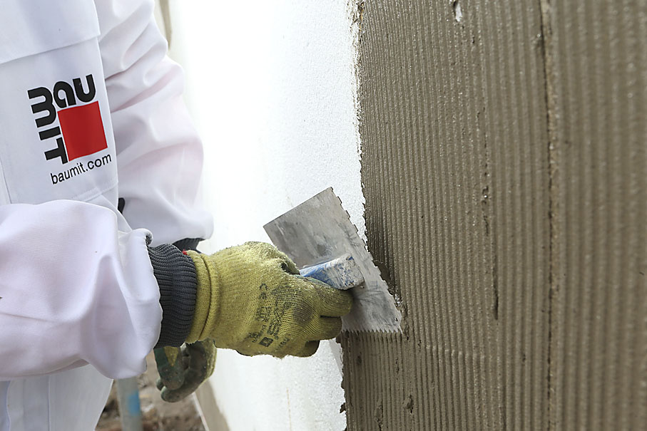 Odlišnosti mezi oběma typy izolantů hledejme i v systému lepení. Jako lepicí hmotu můžeme využít Baumit StarContact, popřípadě Baumit SupraFix. Při lepení se u polystyrenových fasádních desek Baumit EPS-F používá metoda nanesení obvodového rámečku, doplněná třemi vnitřními terči lepicí hmoty o průměru 120 mm na horizontální ose desky s cílem plochy slepu min. 60 % (u běžných ETICS systémů je tato hodnota min. 40 %). Naopak lamely minerální vaty s kolmým vláknem se lepí na podklad vždy celoplošně pro dosažení větší přídržnosti k podkladu. Technologická přestávka pro zatvrdnutí lepicí hmoty je minimálně 24 hodin.