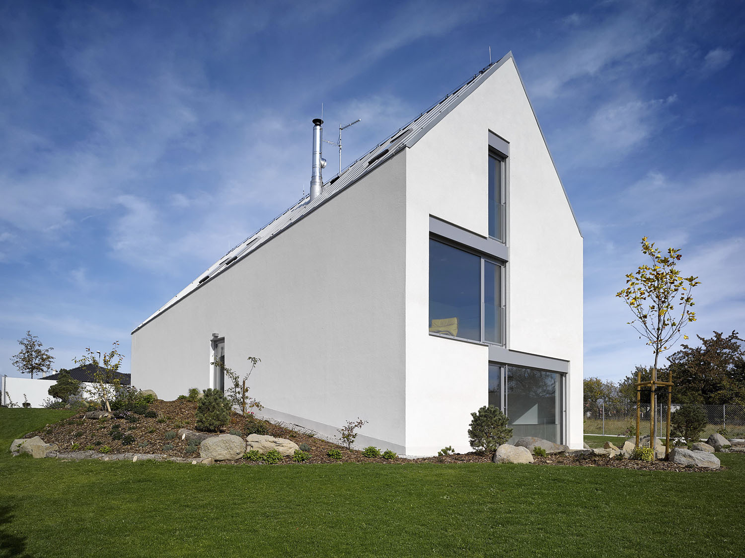 Ján Stempel a Jan Jakub Tesař měli několik dobrých důvodů, aby vybudovali dům s výrazně šikmou střechou. Říkají, že je to šikmá střecha na druhou. Toto řešení jim umožnilo stavbu dobře usadit ve svahu a přitom vytvořit vynikající prostorový koncept interiérů. V jejich ateliéru je navíc samozřejmostí, že navrhují nízkoenergetické stavby. V tomto případě se jedná o dům, kde vytápění zajišťuje tepelné čerpadlo typu vzduch-voda.