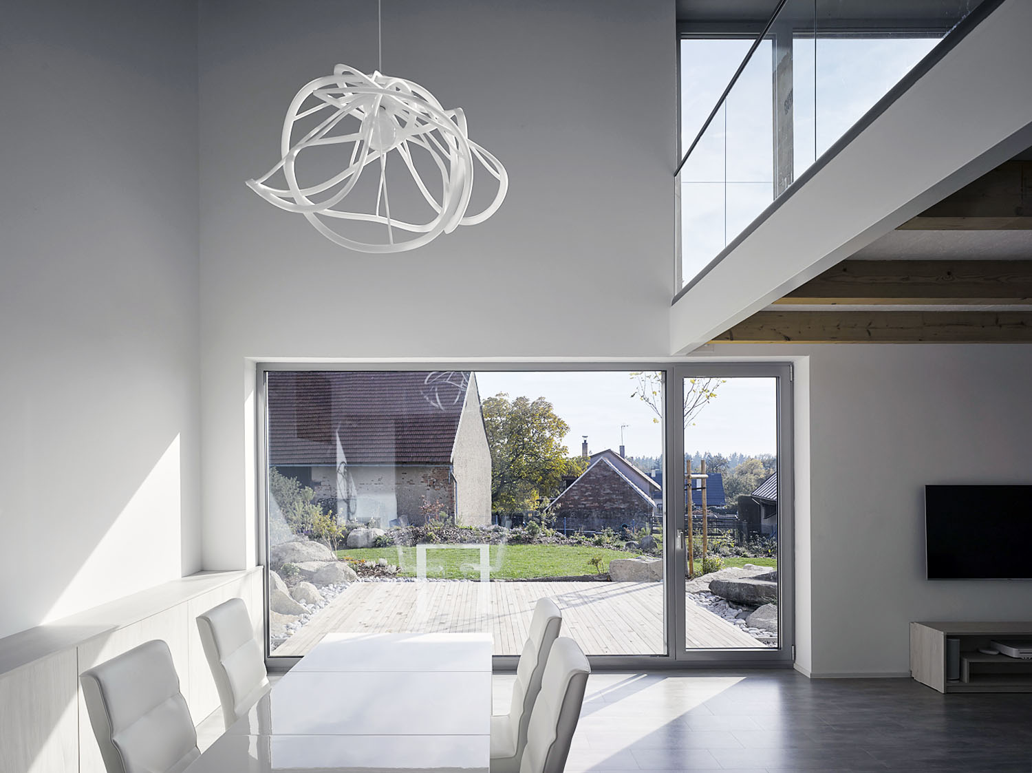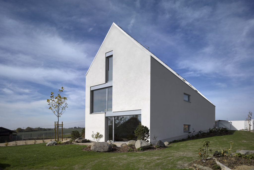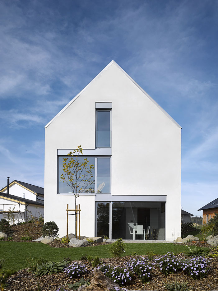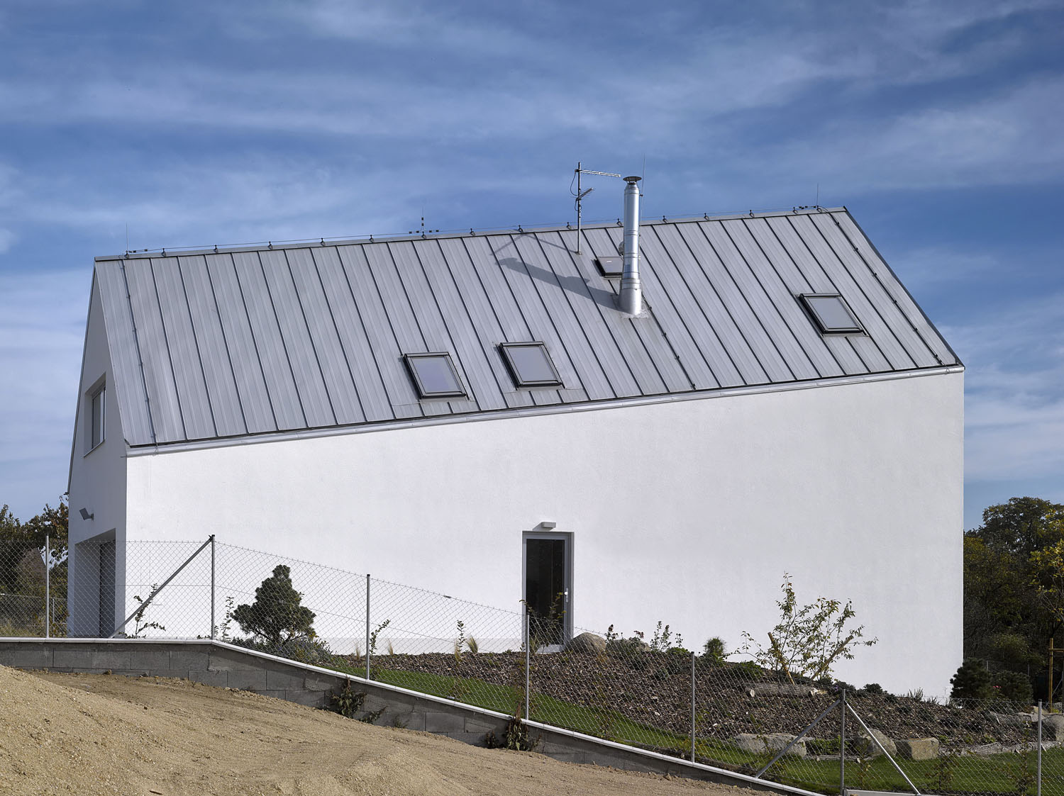 Samozřejmá a logická rozhodnutí autoři projektu zabalili do netradiční formy. Nejedná se však o exhibici ani o snahu se odlišit. Postupovali podle tradičních hodnot stavění našich předků, kdy tvar domu sleduje potřeby uživatelů a místní podmínky. Materiály volili střídmě tak, aby domu daly zklidňující charakter. Společně s minimalistickými detaily nechávají vyniknout proporcím a tvaru stavby. Kombinace bílé hladké omítky se světlou plechovou střechou a přírodními hliníkovými okny se propisuje i do interiéru, do světlých neutrálních odstínů podlahy a nábytku.