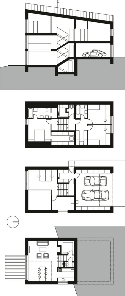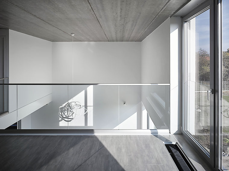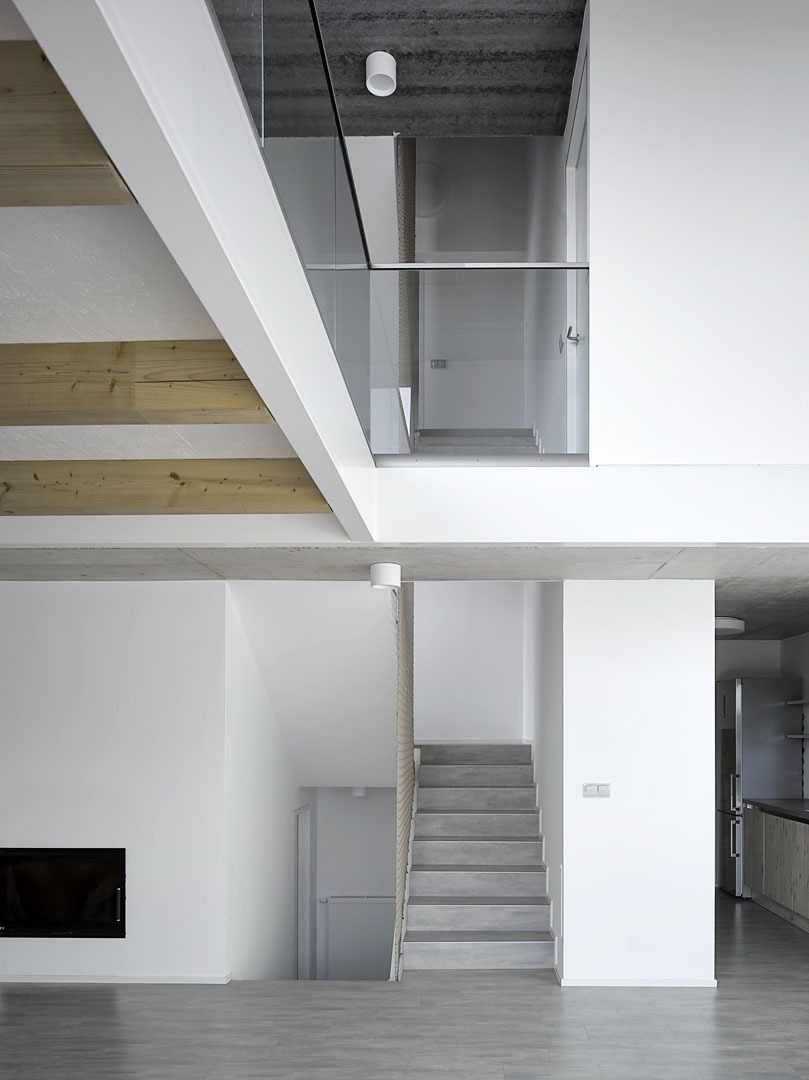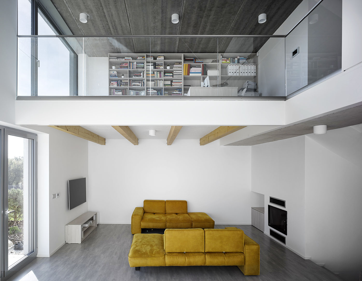 „Sklon pozemku byl na délce domu asi 1,5 metru, tedy polovinu výšky jednoho podlaží. O stejný rozdíl jsme se rozhodli vzájemně posunout i jednotlivé podlahy – v příčném řezu má dům nakonec šest výškových úrovní. Díky tomu je bez ohledu na svažitost přímý vstup a vjezd z ulice. Po schodech se pak sejde do obývacího pokoje s kuchyní a jídelnou na úrovni zahrady. Tento prostor je otevřen na galerii s pracovnou, schodiště dále stoupá kolem dětských pokojů se šatnou a koupelnou až k hlavní ložnici doplněné podobným zázemím. Nejníže položená část domu obsahuje technické zázemí. Obývací pokoj, zapuštěný do svahu, je dle definice ze zákona suterénem, to znamená, že má dům stále jedno nadzemní podlaží a podkroví! Sklon hřebene proti svahu kopíruje vnitřní prostorové uspořádání, nezvyklá forma domu tak odpovídá příčnému rozdělení půdorysu a posunu úrovní o poloviční výšku patra,“ upřesňuje.