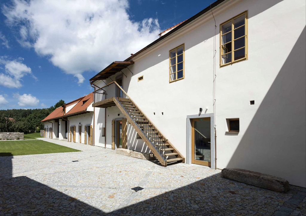 „U prostorového řešení jsme vycházeli z úvahy, že by nebylo vhodné stavbu zatížit obytným podkrovím. Objem budovy, fasády a střechy jsme tedy zachovali bez výraznějších zásahů, zůstaly původní vstupy a vlastně i dispozice. Abychom dosáhli potřebné kapacity lůžek, protáhli jsme severní křídlo až na úroveň stodoly, pokoje se nacházejí na místě bývalých stájí, chlévů a sýpky. Nová přístavba respektuje výšku hřebene i hloubku severního traktu, zachovala také vazby mezi interiérem a exteriérem, dvůr a zahradu jsme pohledově propojili,“ říká architekt Luboš Zemen.