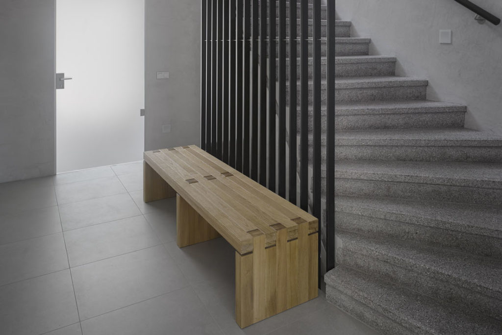 Původní kamenné schodiště bylo vyspraveno a přebroušeno. Nové rameno do suterénu je monolitické a kopíruje půdorysnou stopu horních podlaží. Výtahová šachta je vyzděná z tvárnic ztraceného bednění a kvůli minimálnímu přenosu hluku nezávislá na nosné konstrukci domu.